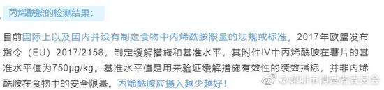 目前国内外对丙烯酰胺均没有安全限量标准,欧盟制定基准水平值是用来验证缓解措施有效性的绩效指标,并非丙烯酰胺在食物中的安全限量。