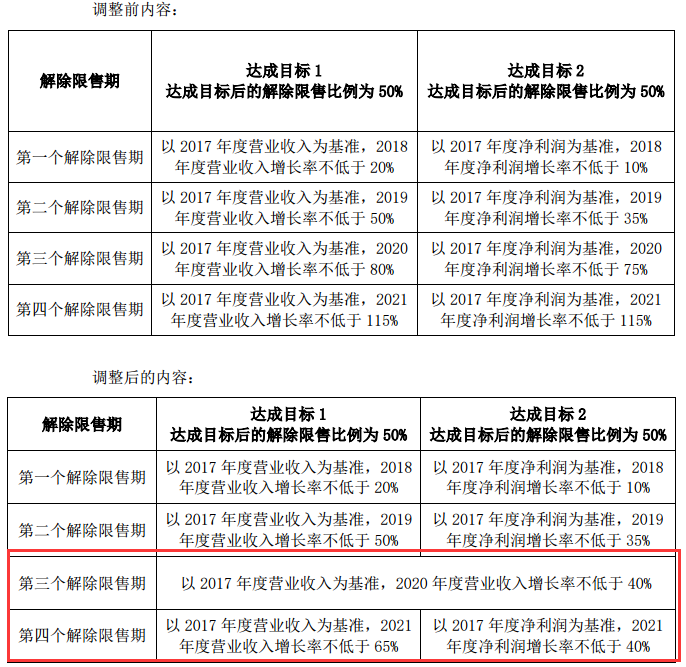在原本的设定中,以2017年度营业收入为基准,公司需在2020年度营业收入增长率不低于80%,净利润增长率不低于75%的目标,此次修改后,营收增长率指标被直接腰斩,下降到了40%,净利润方面更是直接不做要求,取消了相关指标。