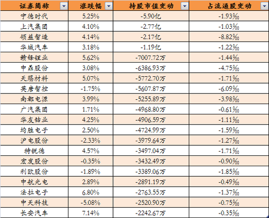 从个股看,以宁德时代、上汽集团为例,昨日分别上涨5.25%、4.10%,但持股市值分别下降5.90亿元和2.77亿元。华域汽车、赣锋锂业、天赐材料等个股均出现类似情况。
