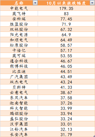 10月以来,汽车板块中,双林股份、松原股份、卡倍亿涨幅超过50%,朗博科技、比亚迪、广汽集团、贝斯特、云意电气、东风汽车、鹏翎股份、江铃汽车、长安汽车等涨幅超过30%。