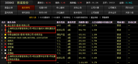 此外,近期热门股胜蓝股份背后也浮现这家投资公司,公司三季报公告,上海明汯投资管理有限公司旗下两只产品持股胜蓝股份1.52%、0.43%,分别位列公司第二和第十流通股东。