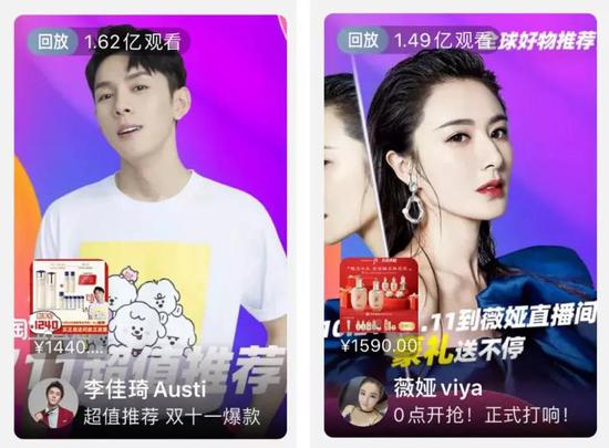从10月20日晚到21日凌晨(金麒麟分析师),淘宝头部主播李佳琦、薇娅同步开启了“双11”直播。淘宝直播榜单显示,薇娅和李佳琦“双11”首日直播总销售额分别录得32.21亿元和33.27亿元,总额逼近70亿。其中李佳琦的直播观看人数为1.62亿人次,薇娅1.42亿,“双11”预售首日,两位头部主播的直播观看总人数已逾3亿人。