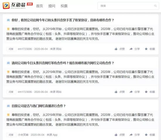 今年6月初,因赛集团在深交所互动易回答投资者提问时表示:“从2019年开始,公司已涉足网红直播营销。2020年,公司已经与巨量引擎签署了代理商数据推广商务合作协议(包括:头条、抖音等框架协议),并与快手签署了年度框架协议,推动公司核心主营业务与网红直播营销的融合发展。”