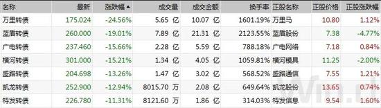 周二可转债市场行情转暖收盘涨0.31%,逾六成转债上涨,但成交额进一步回落至416亿元。随着市场炒作热情降温,“强赎+高溢价”转债遭大幅抛售,曾连涨10日的万里转债大跌逾24%,领跌两市。