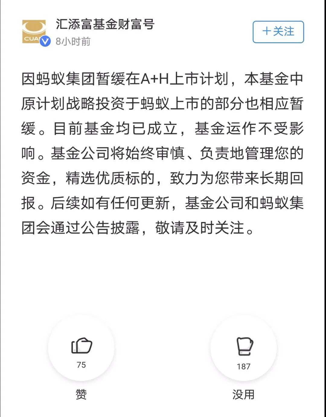 原标题:蚂蚁暂缓上市!千万持有人的“蚂蚁配售”基金紧急公告…