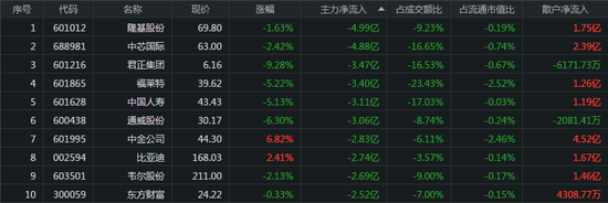 从个股来看,隆基股份、中芯国际、君正集团分别遭主力资金卖出4.99亿元、4.88亿元、3.47亿元。