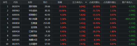 从个股来看,主力资金最青睐的3只股票分别是国轩高科、华东医药、招商银行,流入金额分别为8.04亿元、5.98亿元、5.82亿元,所对应的涨幅分别为10.01%、10.00%、4.10%。