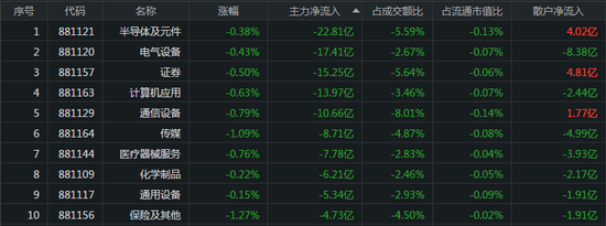 主力资金流出的板块分别是半导体及元件、电气设备、证券,主力资金流出金额分别为22.81亿元、17.41亿元、15.25亿元,其中散户净流入金额为4.02亿元、-8.38亿元、4.81亿元。
