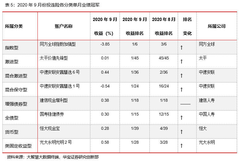 9月收益率排名在前列的投连账户包括,光大永明光明2号(0.58%)、国华1号平衡型(0.50%)、中德安联安赢慧选6号(0.44%)、弘康弘云1号(0.43%)、国华1号稳健型(0.43%)。