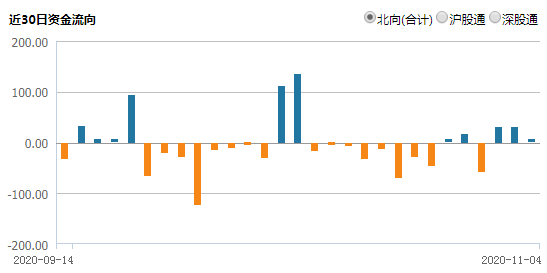 北向资金,今日小幅净流入2.36亿元,沪市净流入2.38亿元,深市净流出0.02亿元。