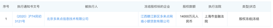 (2020)沪74民初3121号显示,一并成为被执行人还有北京多来点信息技术有限公司,冻结股权标的企业:江西赣江新区多来点网络小额贷款有限公司,被冻结权益数额:14000万元人民币。