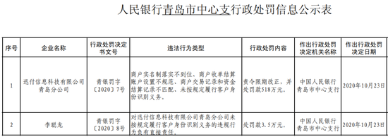 责令限期改正,并处罚款518万元。同时迅付信息科技青岛分公司未按规定履行客户身份识别义务的违规行为负有直接责任的李聪龙,被处罚款3.5万元。