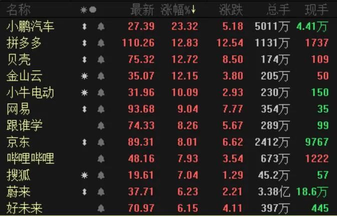 其他热门中概股普遍收涨,拼多多涨近13%,京东涨超8%,阿里巴巴涨3.69%,百度涨4.62%,蛋壳公寓涨13.7%,贝壳涨12.84%,金山云涨12.15%,网易涨9.04%,哔哩哔哩涨7.93%。