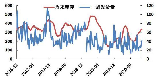 国庆过后,北方港口玉米到港量大幅上升,但发货速度增幅相对偏慢,港口库存快速累积。截止2020年10月下旬,辽宁四港总库存333.9万吨,同比增加约40%。