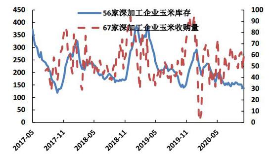 玉米库存来看,8月份以后玉米库存始终维持较低水平。后期,随着玉米上市速度的加快,玉米收购量预计稳步提升,深加工企业玉米库存也将季节性回升。