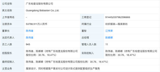 天眼查显示,广东柏堡龙股份有限公司,成立于2006年,是一家专注于服装设计,同时根据客户要求对设计款式提供配套组织生产的企业,公司实控人系陈伟雄、陈娜娜夫妻,分别持股30.76%、18.47%。2015年,柏堡龙在深交所上市。