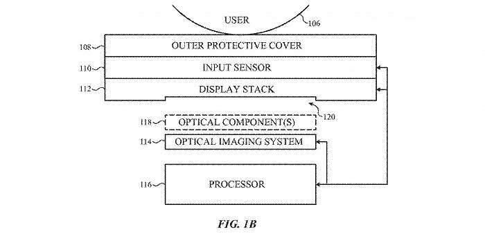 苹果在上述专利中指出,将光学成像系统放置在显示屏附近是可能的,但这样会使边框比设计者预期的更厚。因此与之不同的是,苹果的光学成像系统将位于主显示屏堆栈的下方,该堆栈通常由外部保护层、触摸感应层和显示屏本身组成。