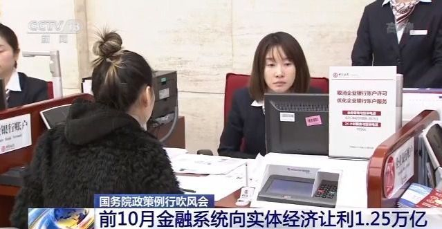 国务院新闻办公室今天(6日)举行国务院政策例行吹风会,中国人民银行、银保监会负责人介绍,前10个月,金融系统已向实体经济让利1.25万亿元。