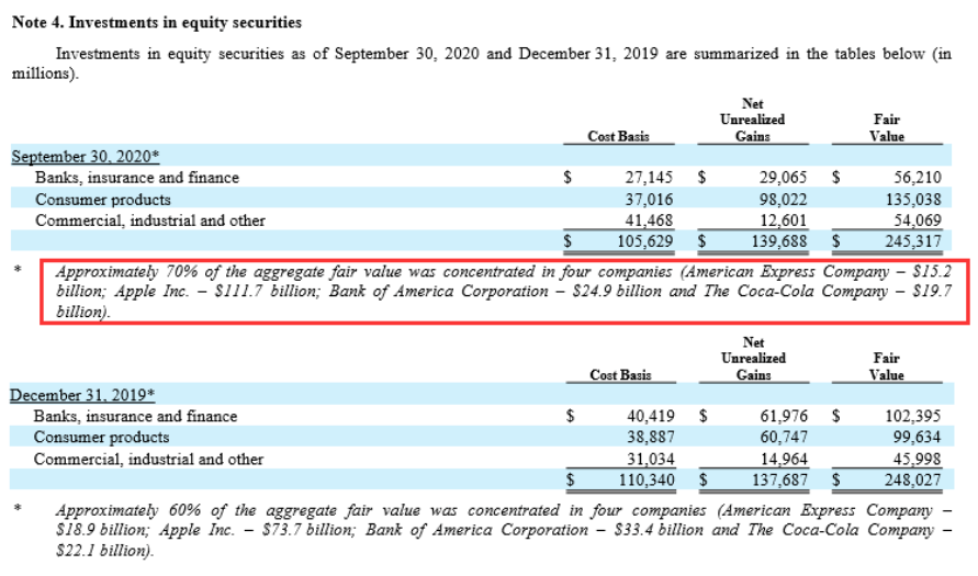 对比去年年底前四大重仓股没有发生变化,但持股集中度明显提高。当时伯克希尔·哈撒韦大约60%的股票持仓集中在四只股票:美国运通(持股189亿美元)、苹果(937亿美元)、美国银行(334亿美元)、可口可乐(221亿美元)。