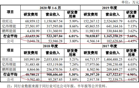 2017年至2020年1-6月,博力威研发费用分别为2917.38万元、3702.40万元、4566.14万元、2048.78万元,占营业收入的比例分别为4.02%、3.89%、4.45%、3.80%。同行业公司研发费用率均值分别为4.90%、5.30%、5.60%、6.01%。