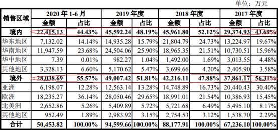 2017年至2020年1-6月,博力威境内收入分别为2.94亿元、4.60亿元、4.56亿元、2.24亿元,占比分别为43.69%、52.12%、48.19%、44.43%;境外收入分别为3.79亿元、4.22亿元、4.90亿元、2.80亿元,占比分别为56.31%、47.88%、51.81%、55.57%。