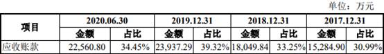 2017年至2020年1-6月,博力威应收账款余额分别为1.61亿元,1.90亿元、2.53亿元、2.39亿元,占营业收入比例分别为22.19%、19.97%、24.69%、44.39%,可比上市公司均值分别为44.85%、45.18%、37.07%、91.68%。