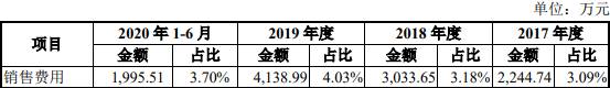 2017年至2020年1-6月,博力威销售费用分别为2244.74万元、3033.65万元、4138.99万元、1995.51万元,占营业收入比例分别为3.09%、3.18%、4.03%、3.70%。