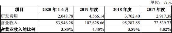 2017年至2020年1-6月,博力威研发费用分别为2917.38万元、3702.40万元、4566.14万元、2048.78万元,占营业收入的比例分别为4.02%、3.89%、4.45%、3.80%。