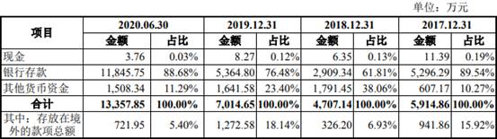 2017年至2020年1-6月,博力威货币资金中现金分别为11.39万元、6.35万元、8.27万元、3.76万元,银行存款分别为5296.29万元、2909.34万元、5364.80万元、1.18亿元,其他货币资金分别为607.17万元、1791.45万元、1641.58万元、1508.34万元,存放在境外的款项总额分别为941.86万元、326.20万元、1272.58万元、721.95万元。