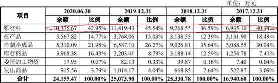 2017年至2020年1-6月,博力威存货余额分别为1.69亿元、2.53亿元、2.51亿元、2.42亿元,其中,原材料分别为6935.10万元、9268.55万元、1.14亿元、1.04亿元。