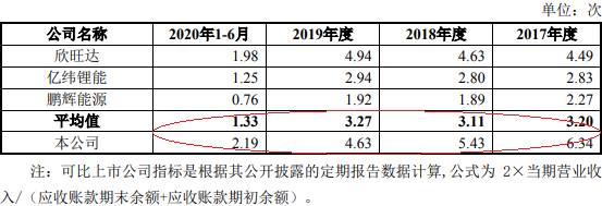 2017年至2020年1-6月,博力威应收账款周转率分别为6.34次、5.43次、4.63次、2.19次,可比上市公司均值分别为3.20次、3.11次、3.27次、1.33次。