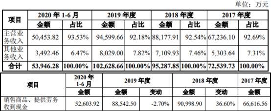 2017年至2020年1-6月,博力威营业收入分别为7.25亿元、9.53亿元、10.26亿元、5.39亿元,其中,主营业务收入分别为6.72亿元、8.82亿元、9.46亿元、5.05亿元;销售商品、提供劳务收到现金分别为6.66亿元、9.10亿元、8.85亿元、5.26亿元。