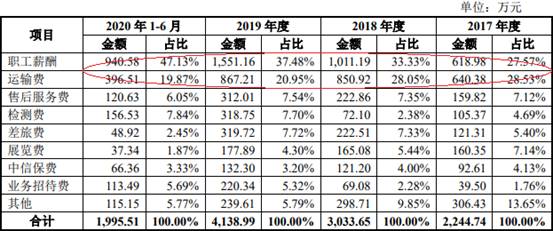 2017年至2020年1-6月,博力威销售费用中职工薪酬分别为618.98万元、1011.19万元、1551.16万元、940.58万元,占比分别为27.57%、33.33%、37.48%、47.13%;运输费分别为640.38万元、850.92万元、867.21万元、396.51万元,占比分别为28.53%、28.05%、20.95%、19.87%。