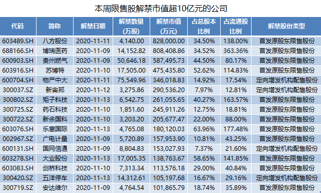 博瑞医药(维权)(688166.SH)同样面临上市一年的限售股解禁。11月9日,博瑞医药有1.42亿股首发限售股解禁,占总股本比例34.52%,解禁市值80.84亿元。这批限售股解禁后,公司流盘将大增3.63倍,是本周流通盘增加比例最高的公司。