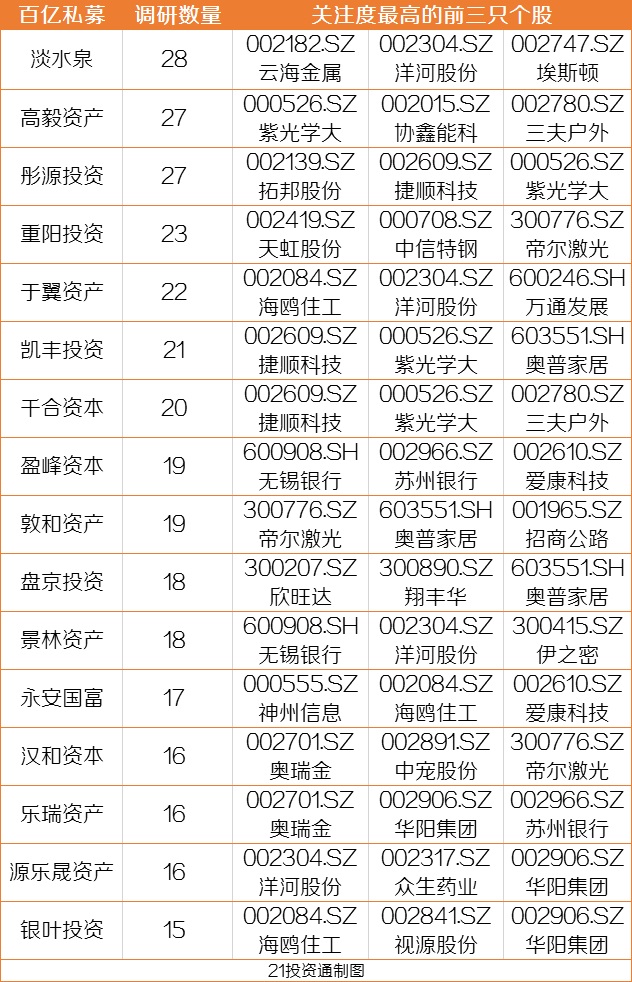 其中洋河股份(002304.SZ) 、紫光学大(000526.SZ) 最受百亿私募青睐,获淡水泉、高毅资产、千合资本等8家百亿私募调研。