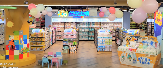 店内除了商品陈列,还设置了人气游乐区,集商品销售、互动体验为一体;商品方面以高性价比为原则,涵盖常用母婴、奶粉、纸尿裤、婴儿用品、辅食等各类用品,SKU总计近千支。