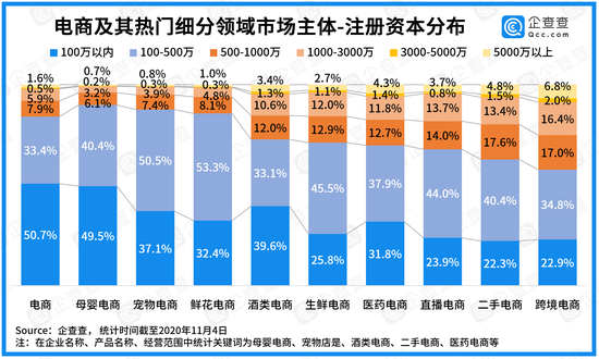 企查查数据显示,我国电商行业有5成企业的注册资本集中在100万以内,而注册资本500万以内的占比超8成,也就是说,整个电商行业主要由小微企业构成。从电商的垂直领域来看,企查查数据显示,母婴、宠物、鲜花这三个领域近9成企业注册资本在500万以内,小微企业的集聚程度较整个电商行业更甚之。