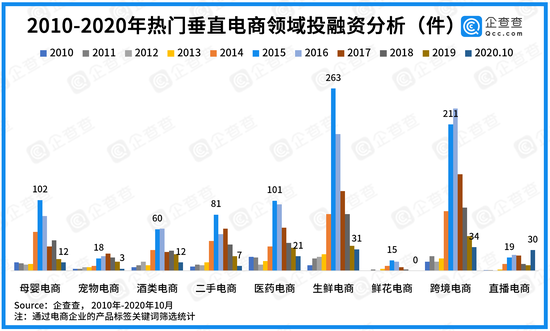 从垂直电商的投融资情况来看,企查查数据显示,近十年来,跨境电商和生鲜电商的投融资事件最多,分别有910件、876件;其次是医药电商、母婴电商、二手电商,分别有450件、387件、339件;最后是酒类电商、直播电商、宠物电商、鲜花电商,分别有277件、126件、122件、47件。