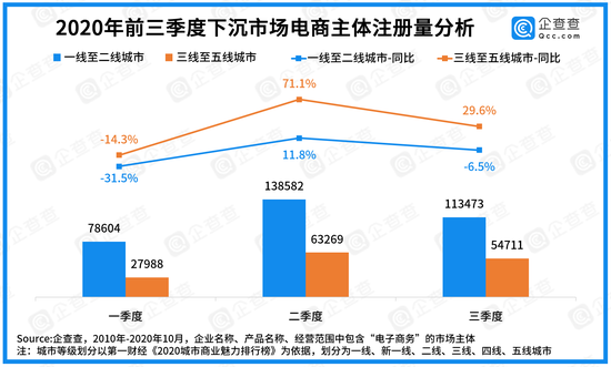 疫情下的下沉市场电商主体表现如何呢?企查查数据显示,2020年一季度高等级城市电商主体注册量近7.9万家,下沉市场约2.8万家,二者均呈现同比下降趋势;二季度高等级城市注册量近14万家,下沉市场6.3万家,其中下沉市场电商主体注册量同比大增71.1%;三季度高等级城市注册量11.3万家,下沉市场约5.5万家,其中下沉市场同比增长29.6%,而高等级城市电商主体注册量同比下降6.5%。由此可知,疫情下的电商主体增量来自于下沉市场。