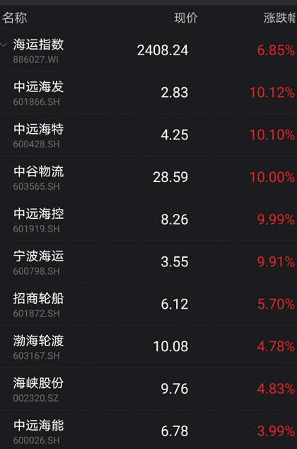 中远海发涨10.12%,中远海特涨10.1%、中远海控、宁波海运也纷纷涨停。