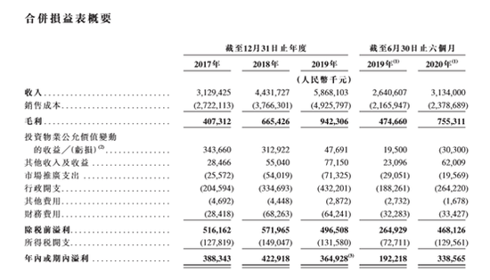 招股书显示,2017年-2019年及2020年上半年,华润万象生活分别实现收入31.29亿元、44.31亿元、58.68亿元、31.34亿元。同期,毛利分别为4.07亿元、6.65亿元、9.42亿元、7.55亿元;公司期内净利分别为3.88亿元、4.23亿元、3.65亿元及3.39亿元。