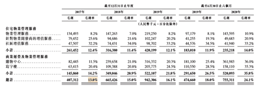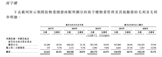 按毛利率来看,2017年-2019年及2020年上半年,华润万象生活的毛利率分别为13.0%、15.0%、16.1%、24.1%,逐年上升。毛利率上升主要是由于商业运营及物业管理服务分部贡献的收入增加,而该分部的毛利率高于住宅物业管理服务分部。按分部来看,2020年上半年,购物中心的毛利率最高,其次为写字楼,最低为住宅物业管理服务,三者毛利率分别为36%、35.3%及14%。然而,据招股书显示,营业纪录期间,公司提供物业管理服务的购物中心全部由华润集团及华润置地(连同各自的合营企业和联营公司)开发或拥有。此外,2020年上半年,写字楼中来自独立第三开发商的毛利率为12.4%,远低于华润集团及华润置地(连同各自的合营企业和联营公司)的35.9%。
