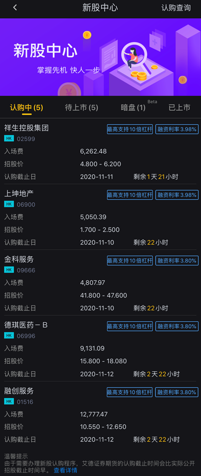 截至11月9日,超20家明星机构看好、手握12款抗肿瘤药物的生物医药企业——德琪医药(06996.HK),行业增长最快的头部物管企业——融创服务(01516.HK),最后一家未上市千亿房企——祥生控股(02599.HK)等多只新股均在火热招股中。艾德证券期货为了助力11月港股打新,更是针对各只新股提供现金打新免认购费、最高十倍杠杆融资打新打新优惠,投资者可上艾德一站通APP进行打新操作。