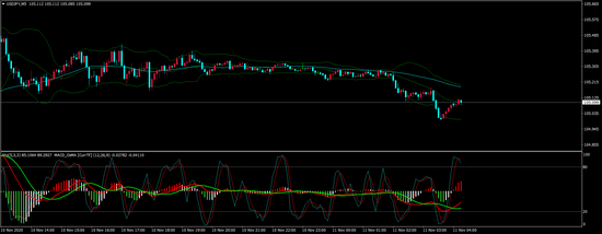 5M:昨日失守105.20一线偏空,今日开盘后继续走低,目前震荡指标趋于超买,日内下方关注4H前支撑,短线逢低做多。