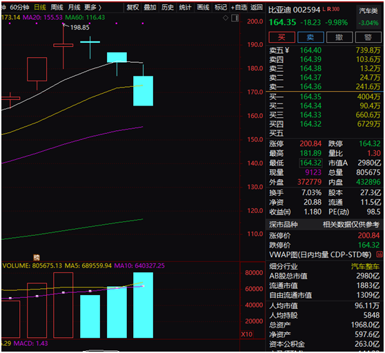 具体个股方面,汽车龙头股比亚迪(002594.SZ)收盘大跌9.98%,盘中一度触及跌停,该股全天成交138.4亿元。港股比亚迪股份(1211.HK)跌幅更大,收盘下跌近15%。