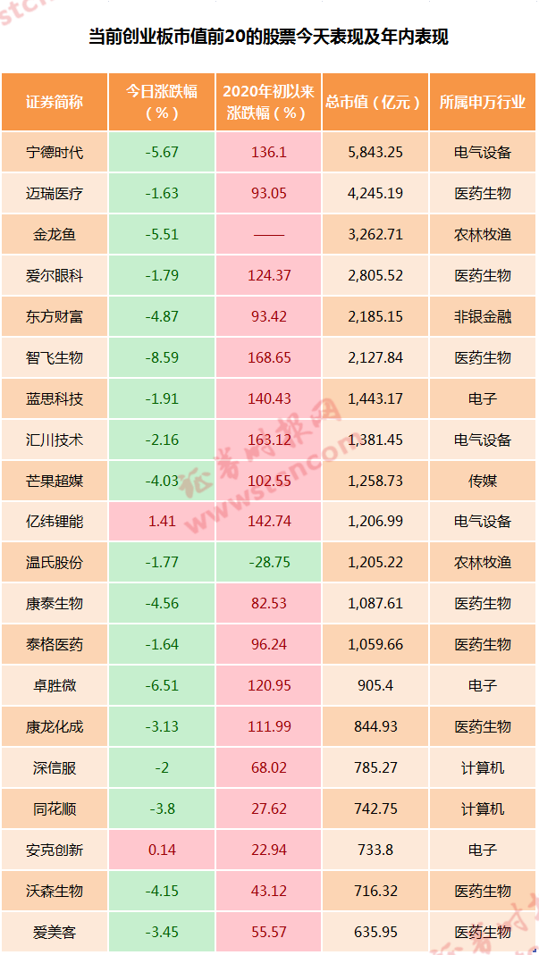 今天创业板市值前20的股票中,除了亿纬锂能和安克创新外,其余全部下跌,其中智飞生物跌幅最大,为8.59%,卓胜微、宁德时代、金龙鱼跌幅均超过5%。