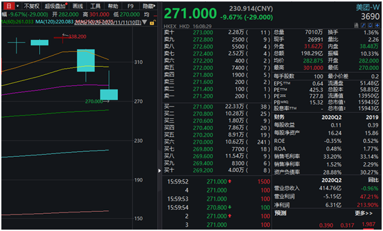 港股科技股中另一大明星股美团继昨日暴跌超10%后,今日再度重挫9.67%,收报271港元。