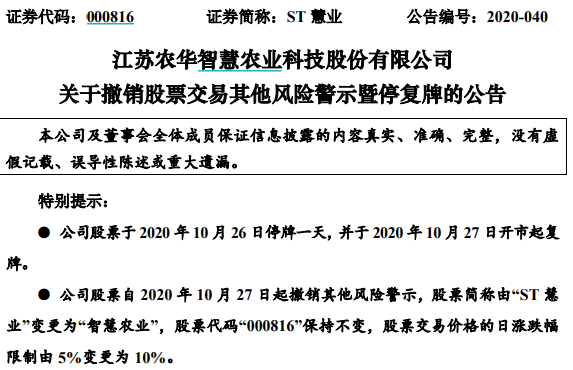 2020年10月25日晚间,公司公告,经逐项核查,公司不存在相关规定被实行退市风险警示的情形,亦不存在被实行其他风险警示的情形。深交所同意公司股票交易撤销其他风险警示的申请。公司股票于10月26日停牌一天,10月27日开市起复牌,并撤销其他风险警示。复牌后,公司股价一路狂飙。
