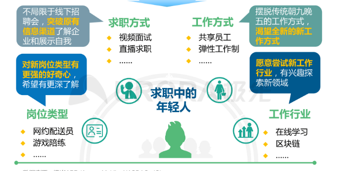 据极光大数据发布《“超职季”招聘行业报告年轻人篇》中的数据显示,年轻人求职需求趋向多元化,他们更愿意从事新兴行业和衍生职位。在求职方式上,年轻人愿意选择线上招聘,参与视频面试、直播求职,成为弹性工作制下的共享员工,愿意尝试网约配送员、游戏陪练、在线学习等新兴工作。