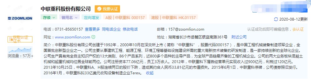 天眼查显示,中联重科股份有限公司为A股上市公司,证券简称中联重科。信息显示,中联重科股份有限公司创建于1992年,2000年10月在深交所上市(简称“中联重科”,代码000157),是中国工程机械装备制造领军企业,全国首批创新型企业之一。公司主要从事建筑工程、能源工程、环境工程等基础设施建设所需的重大高新技术装备的研发制造,是一家持续创新的全球化企业。公司生产具有完全自主知识产权的13大类别、86个产品系列,近800多个品种的主导产品,为全球产品链最齐备的工程机械企业。公司的两大业务板块混凝土机械和起重机械均位居全球前两位。
